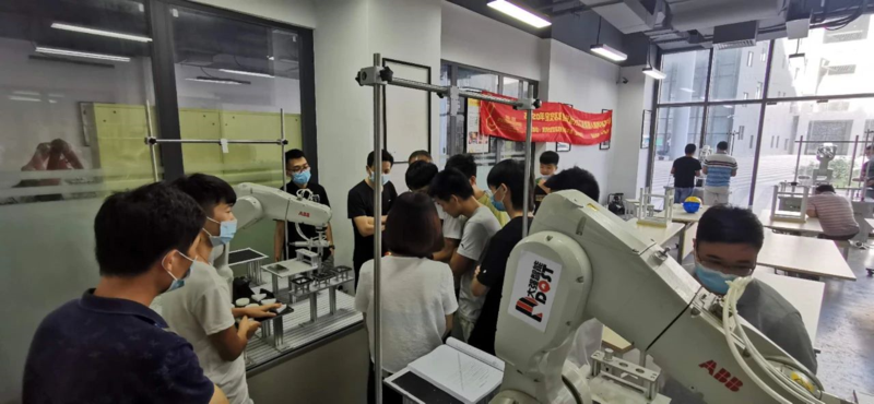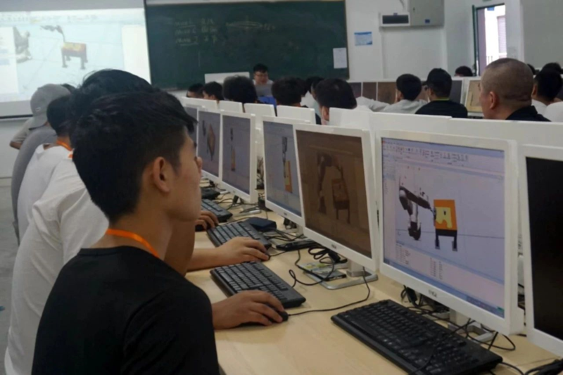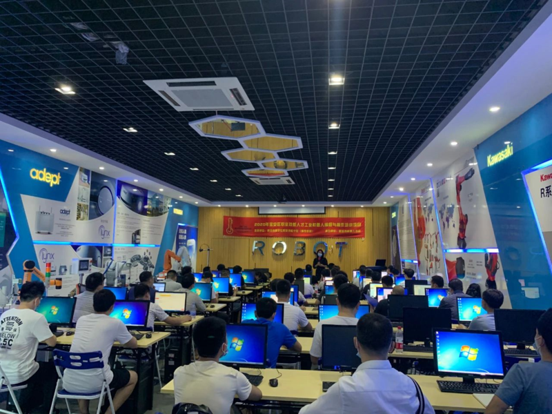 学员们在工业机器人在搬运、码垛、焊接喷涂等领域基本应用、工业机器人操作及程序编写、工业机器人工程应用模拟仿真工程技术、工业视觉系统认知与选型等方面展开深入探讨学习。